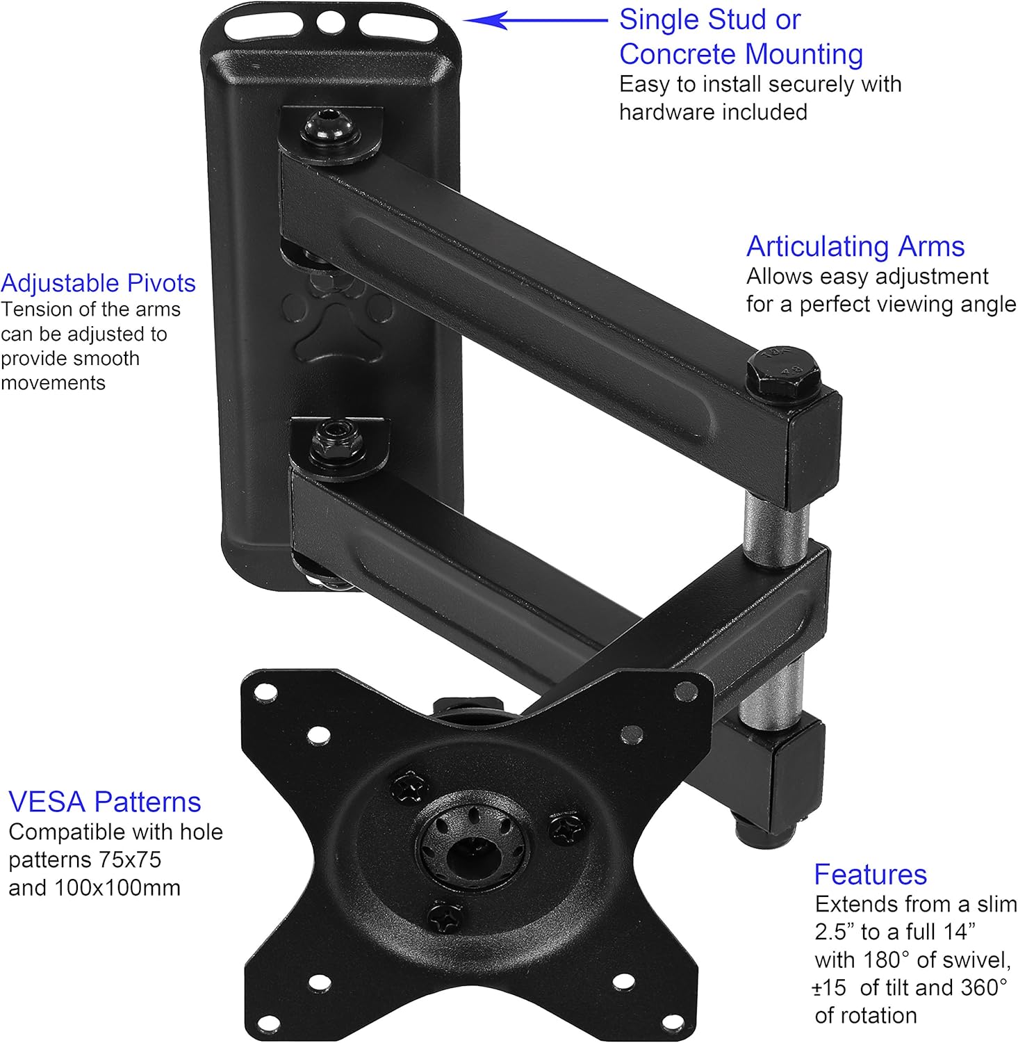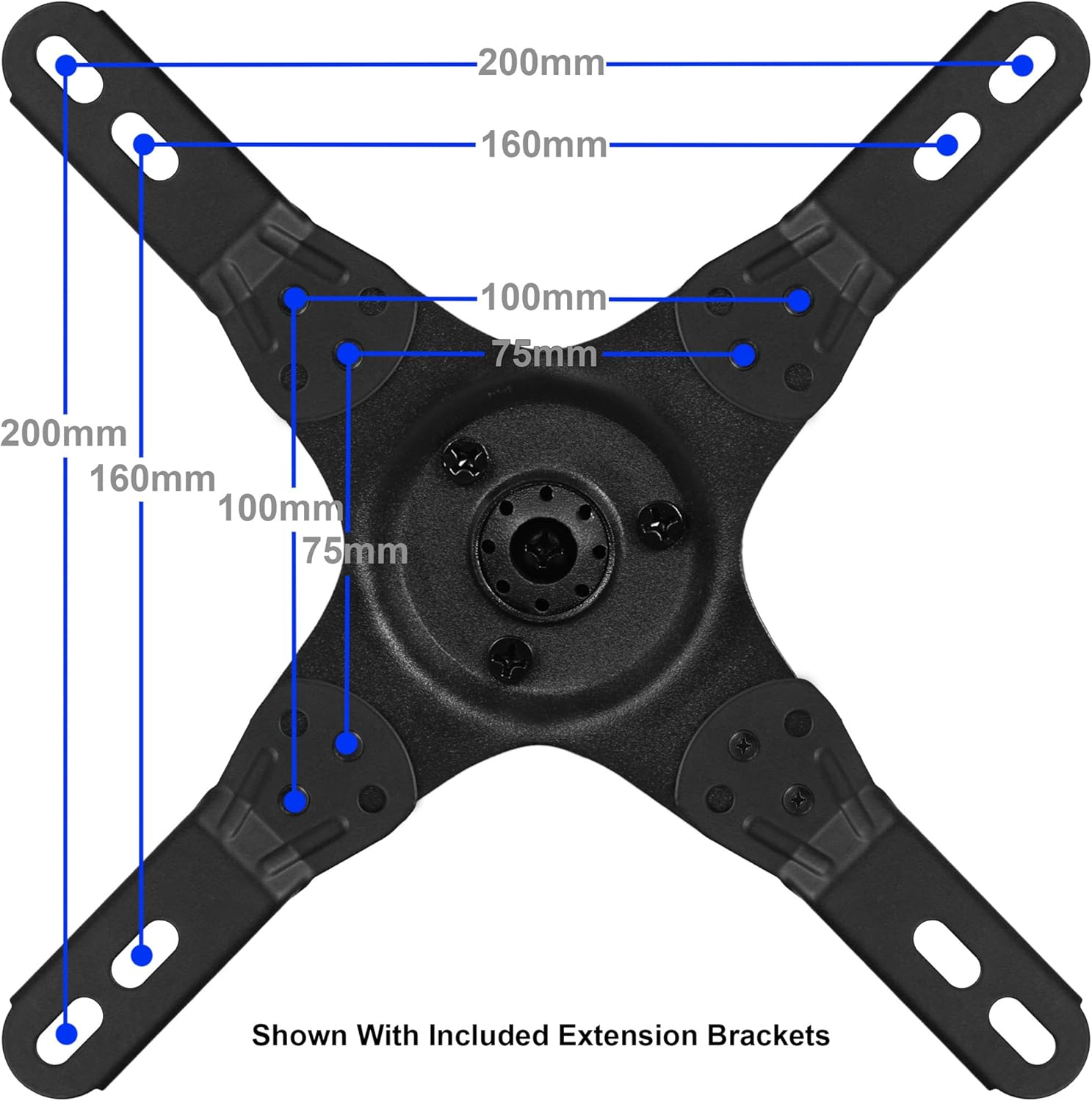 DETACHABLE WING PIECES The base plate at the end of the arm mount fits hole patterns up to VESA 100 for smaller displays. The included "wing" attachment pieces extend the covered hole patterns up to VESA 200.