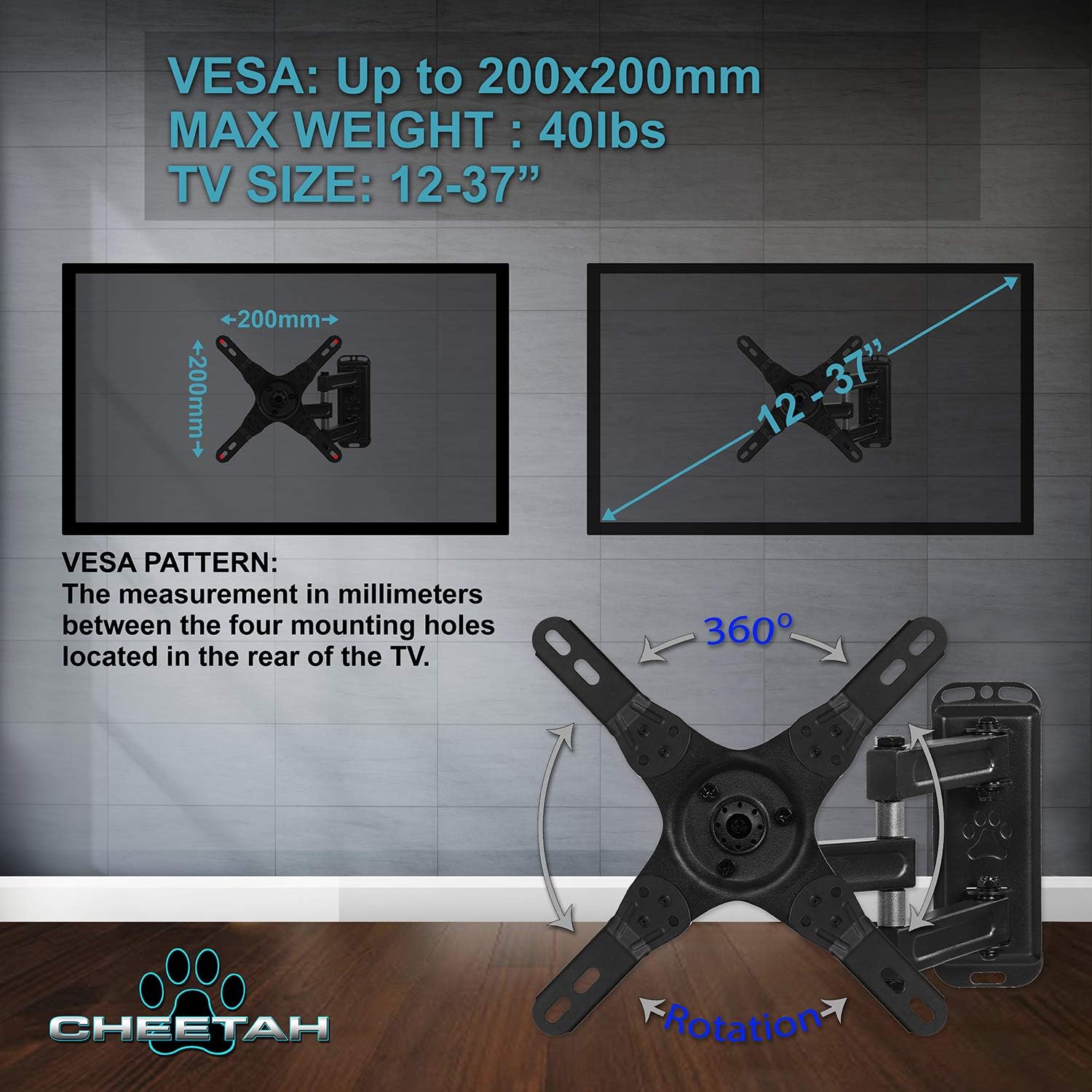 FITS 12-37" TVs up to VESA 200 and 40LBS This mount fits 12-37" TVs (some up to 40”) and Displays with hole patterns up to VESA 200x200 (approximately 8x8”) and up to 40bs.
